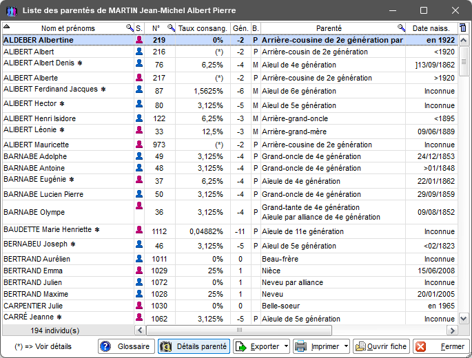 Recherche de toutes les parentés d'un individu